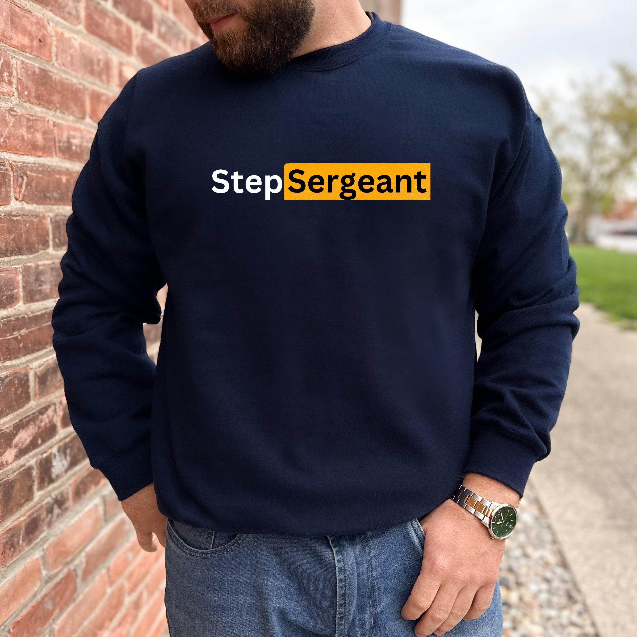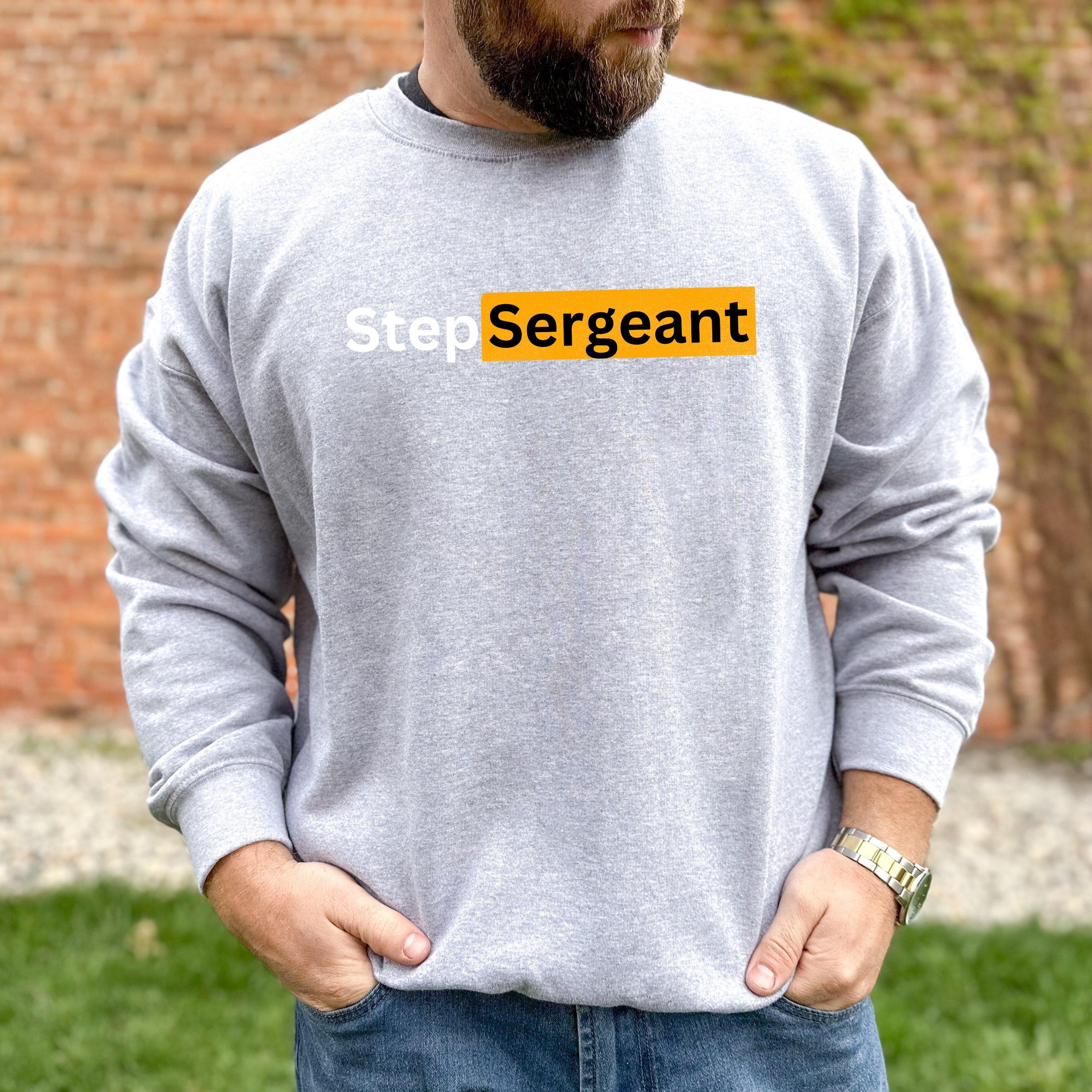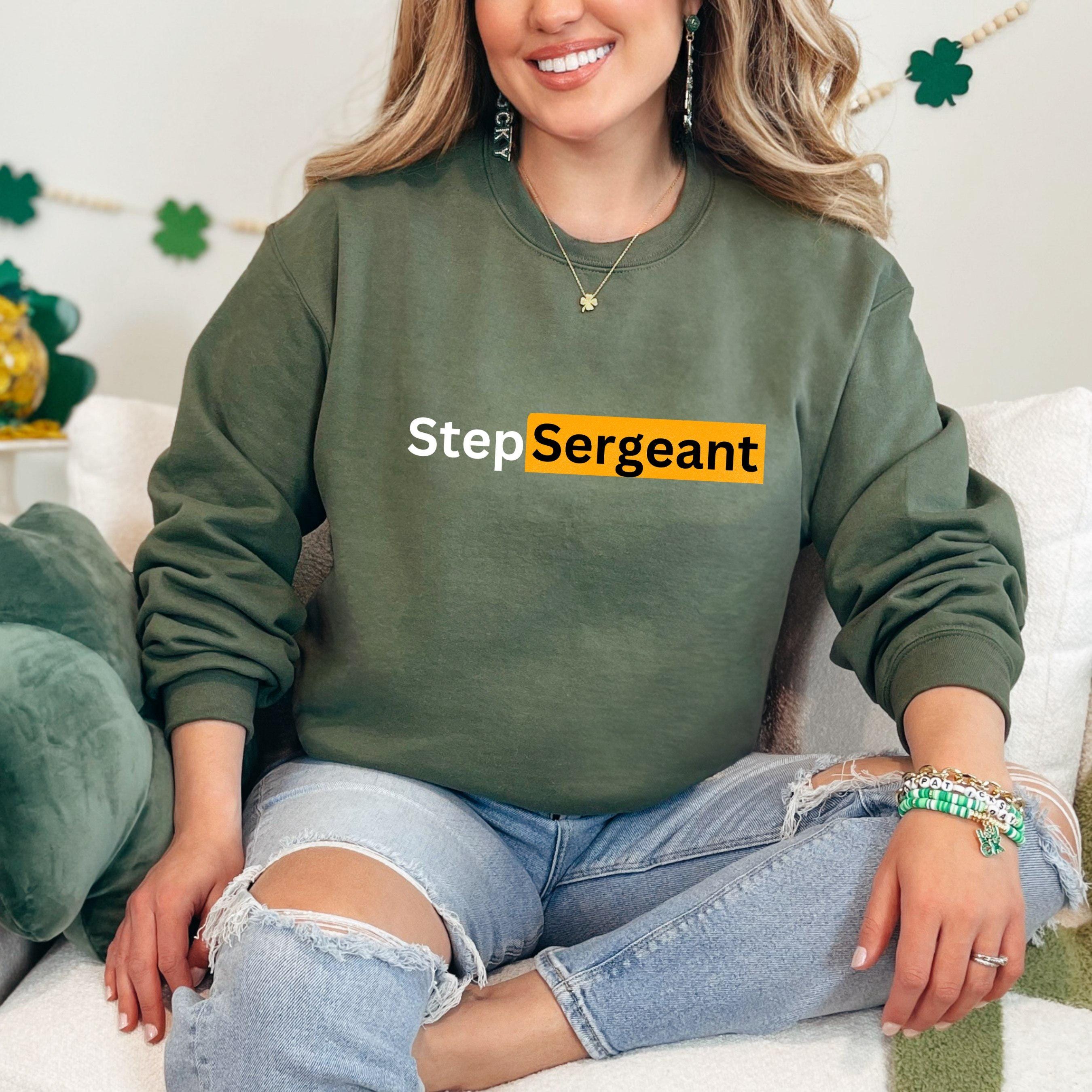 Step up your style with this bold and intriguing adult sweatshirt featuring the enigmatic phrase 'Step Sergeant.' This shirt is a conversation starter, inviting curiosity and interpretation. Whether it's a personal mantra, an inside joke, or a statement of leadership, this tee lets you express yourself in a unique and thought-provoking way. Crafted from comfortable fabric, it combines comfort and individuality, making it an ideal addition to your wardrobe for those who appreciate a touch of mystery in their fashion.