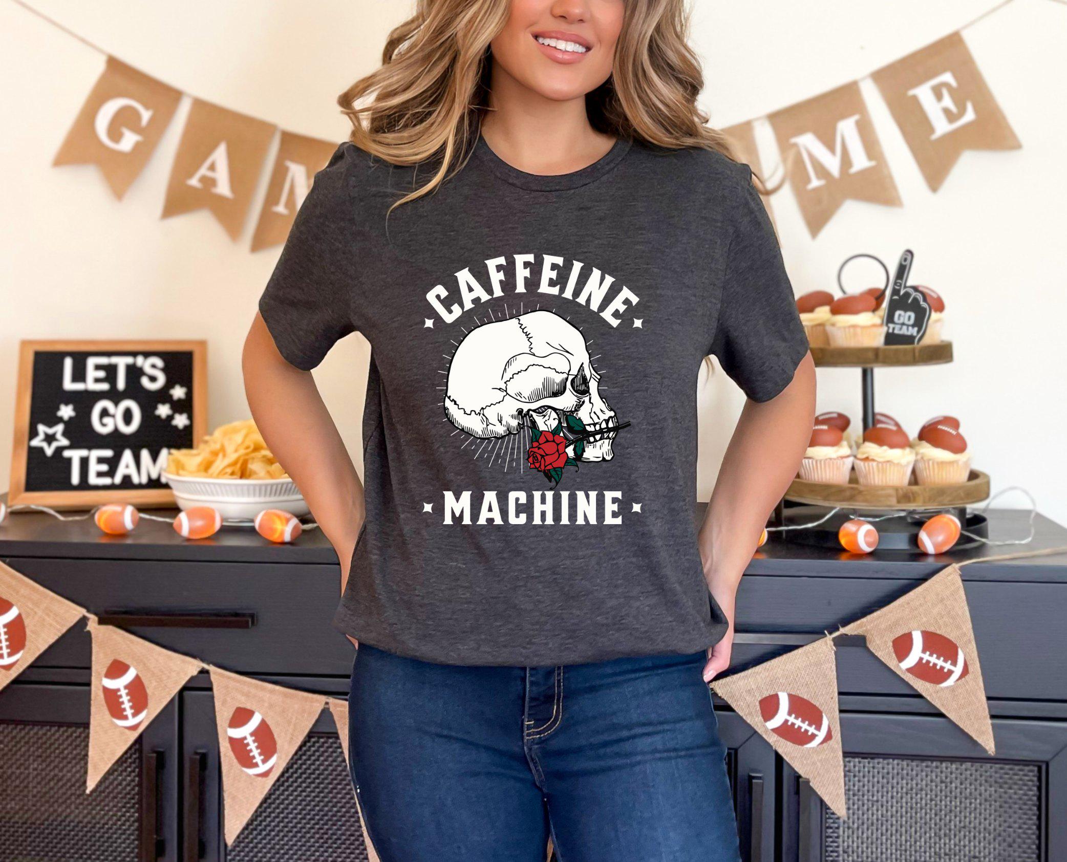 Express your love for caffeine with this unique T-Shirt featuring a skull with a rose in its mouth and the words 'caffeine machine'. Perfect for him or her, this T-Shirt is a great gift for anyone who appreciates a good cup of coffee. Ideal for casual wear, this shirt adds a touch of edginess to any outfit and is great for layering. Perfect for coffee lovers and those who appreciate unique graphic tees. Great for birthdays, holidays, or just everyday wear.