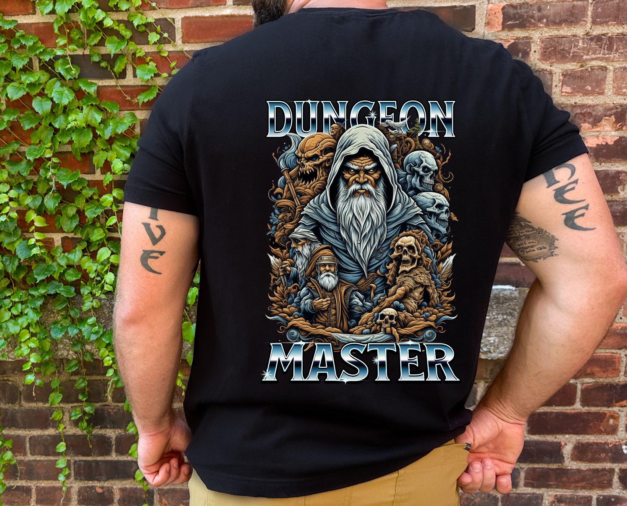 A dungeons and dragons themed T-shirt that says DM on the front and a wizard on the back with the text "Dungeon Master". Perfect for fans of tabletop role-playing games looking for a unique and stylish way to show their love for the game. Great for casual wear, gaming sessions, or geeky events and conventions.