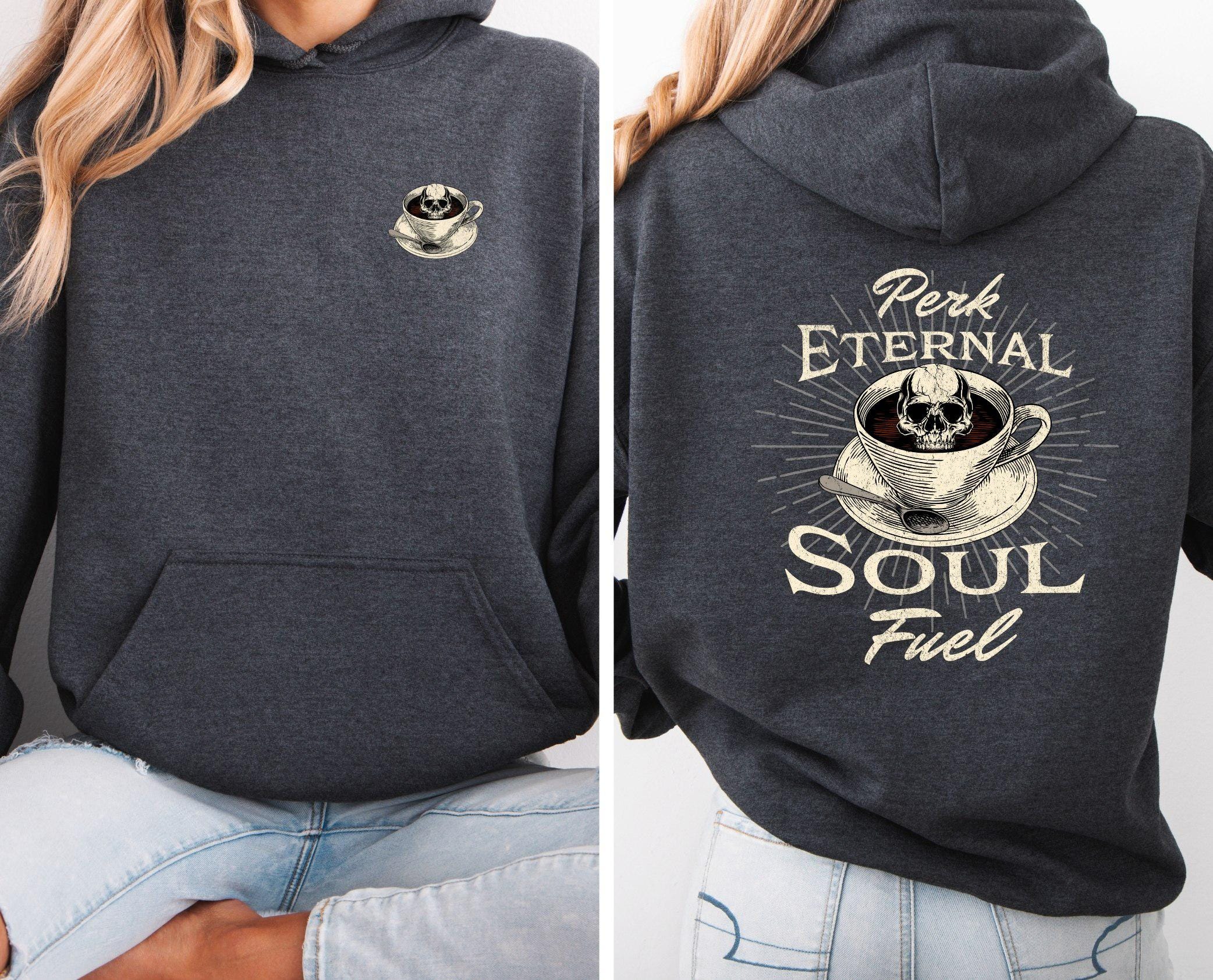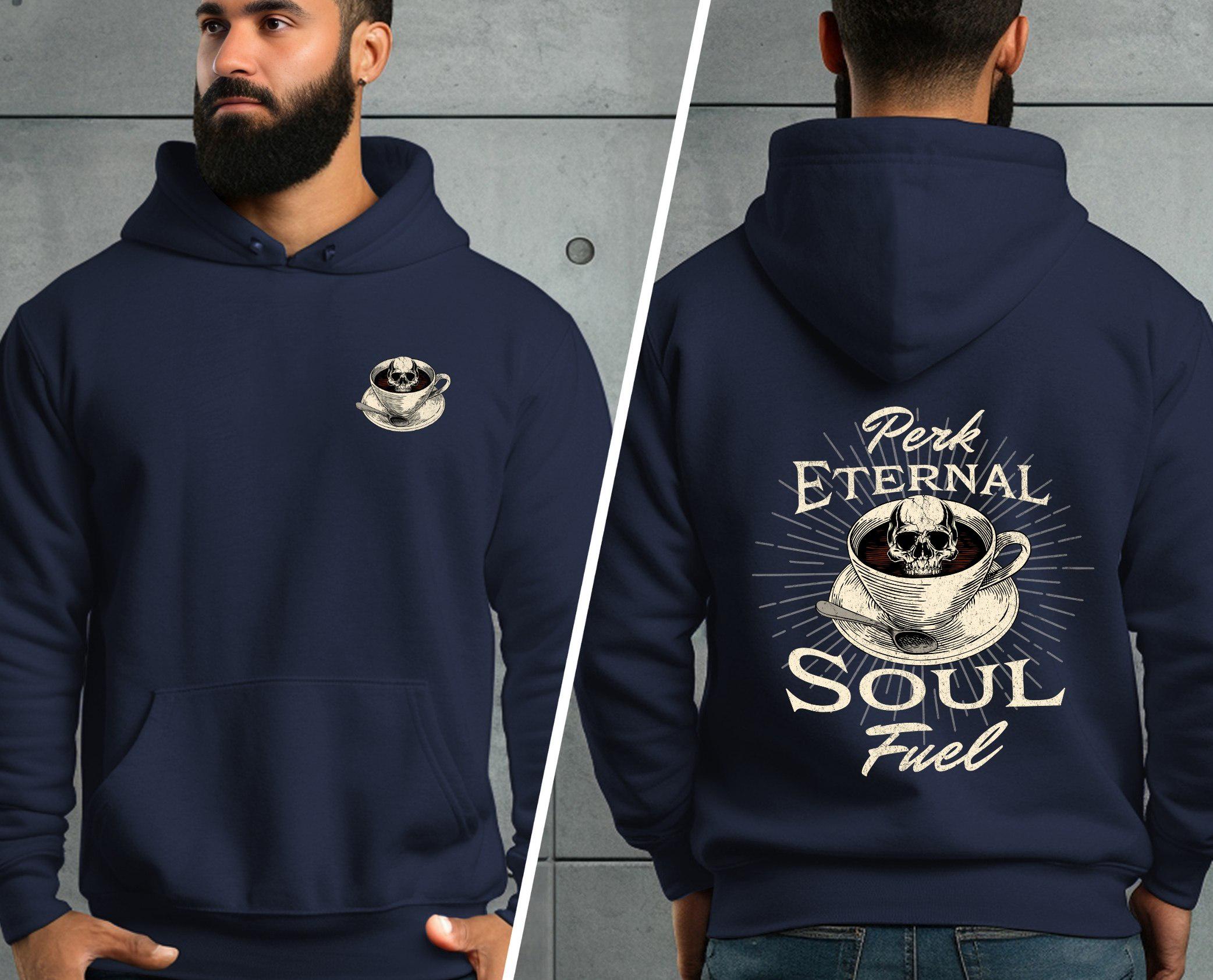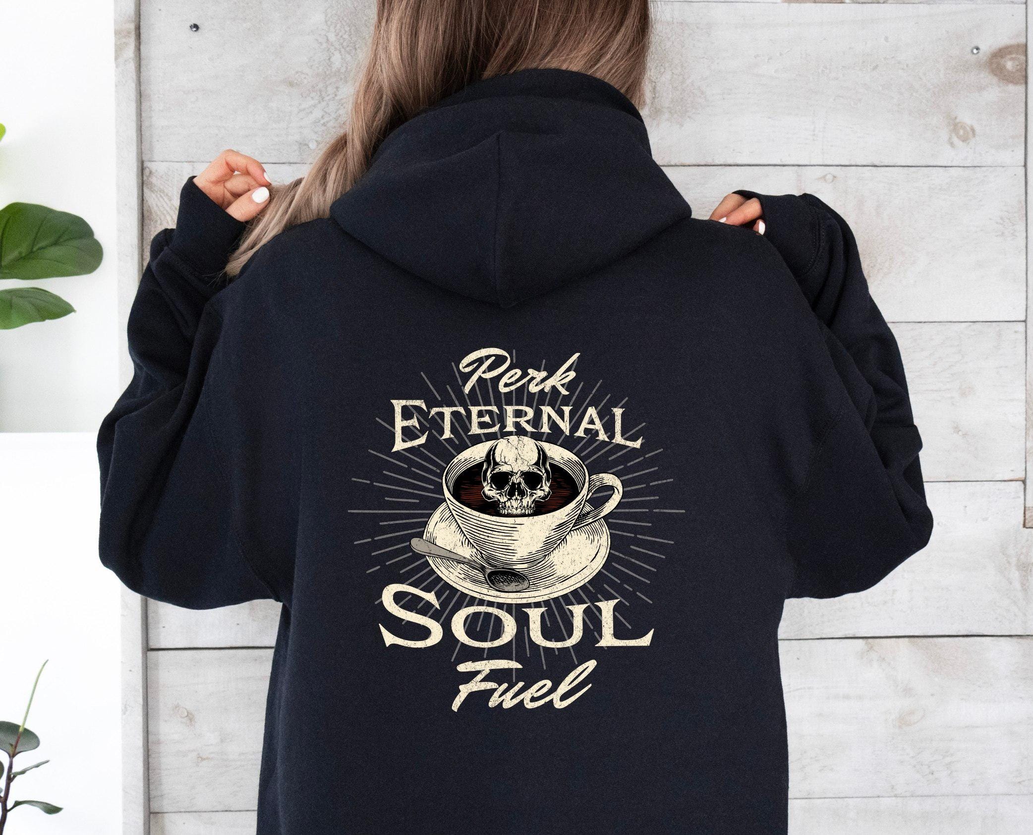 Fuel your soul and your coffee obsession with our bold “Perk Eternal Soul Fuel” hoodie! Featuring a striking skull-in-coffee-cup design surrounded by vintage-style lettering, this hoodie is perfect for caffeine lovers who like their brew as dark as their humor.