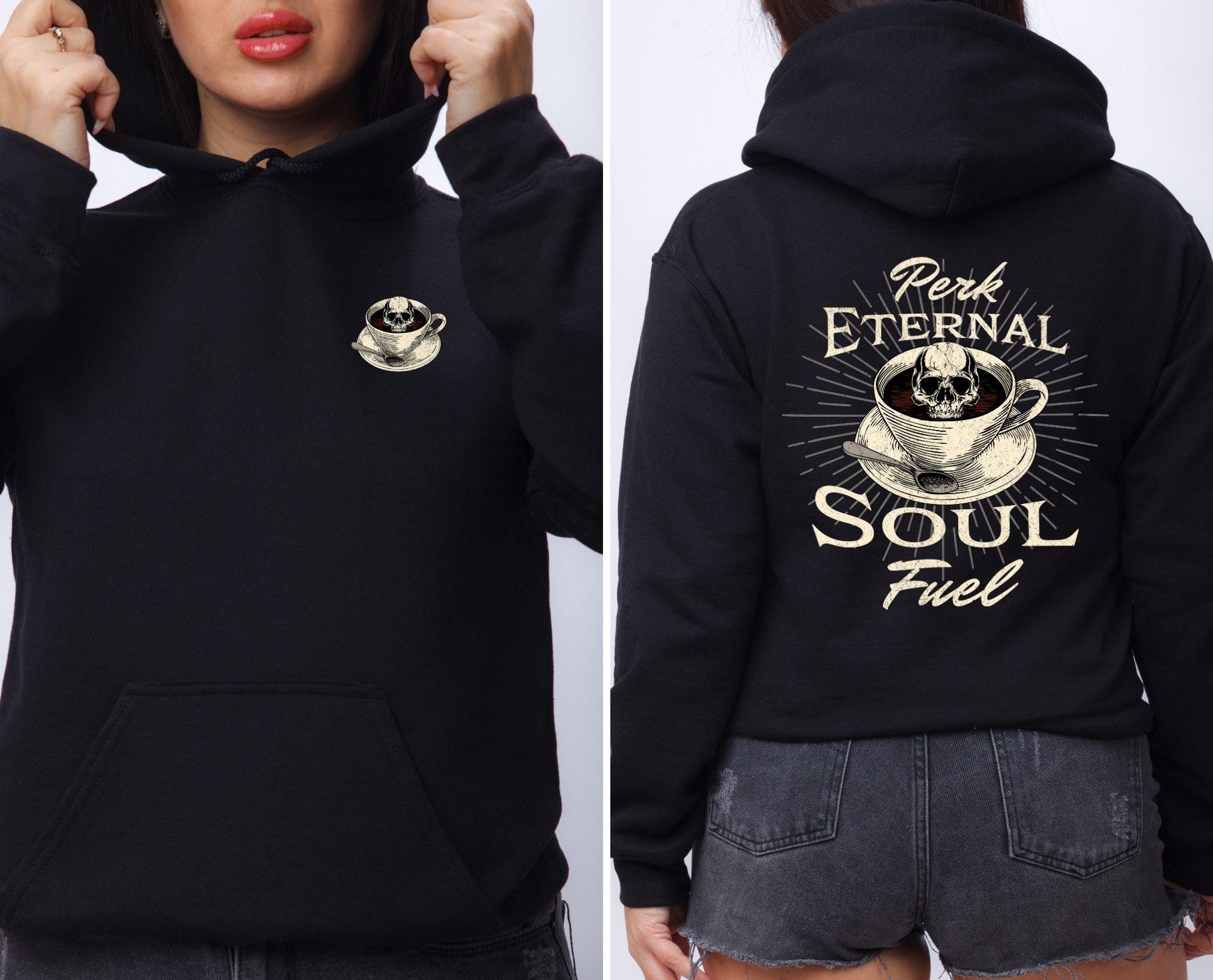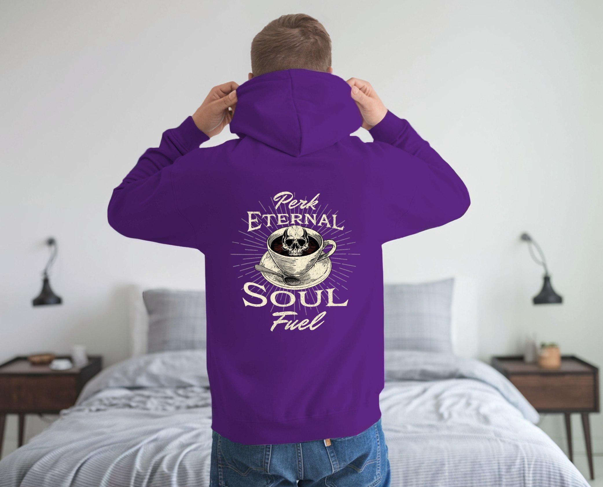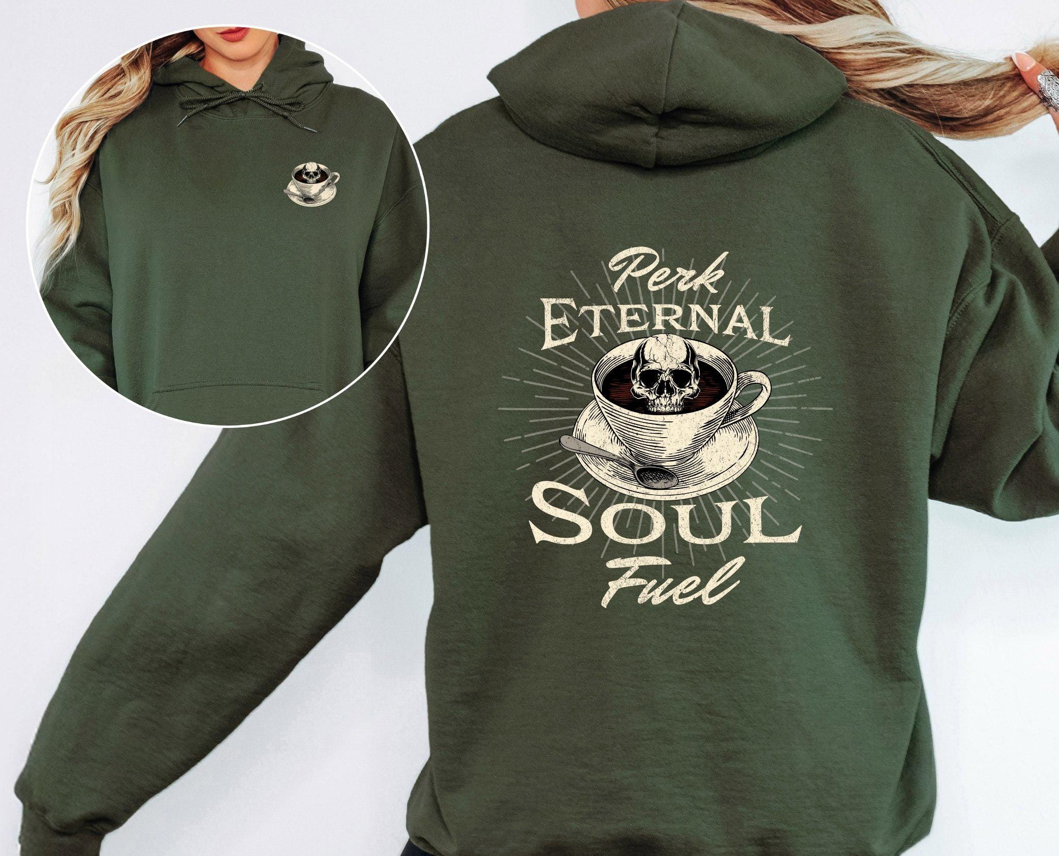 Fuel your soul and your coffee obsession with our bold “Perk Eternal Soul Fuel” hoodie! Featuring a striking skull-in-coffee-cup design surrounded by vintage-style lettering, this hoodie is perfect for caffeine lovers who like their brew as dark as their humor.