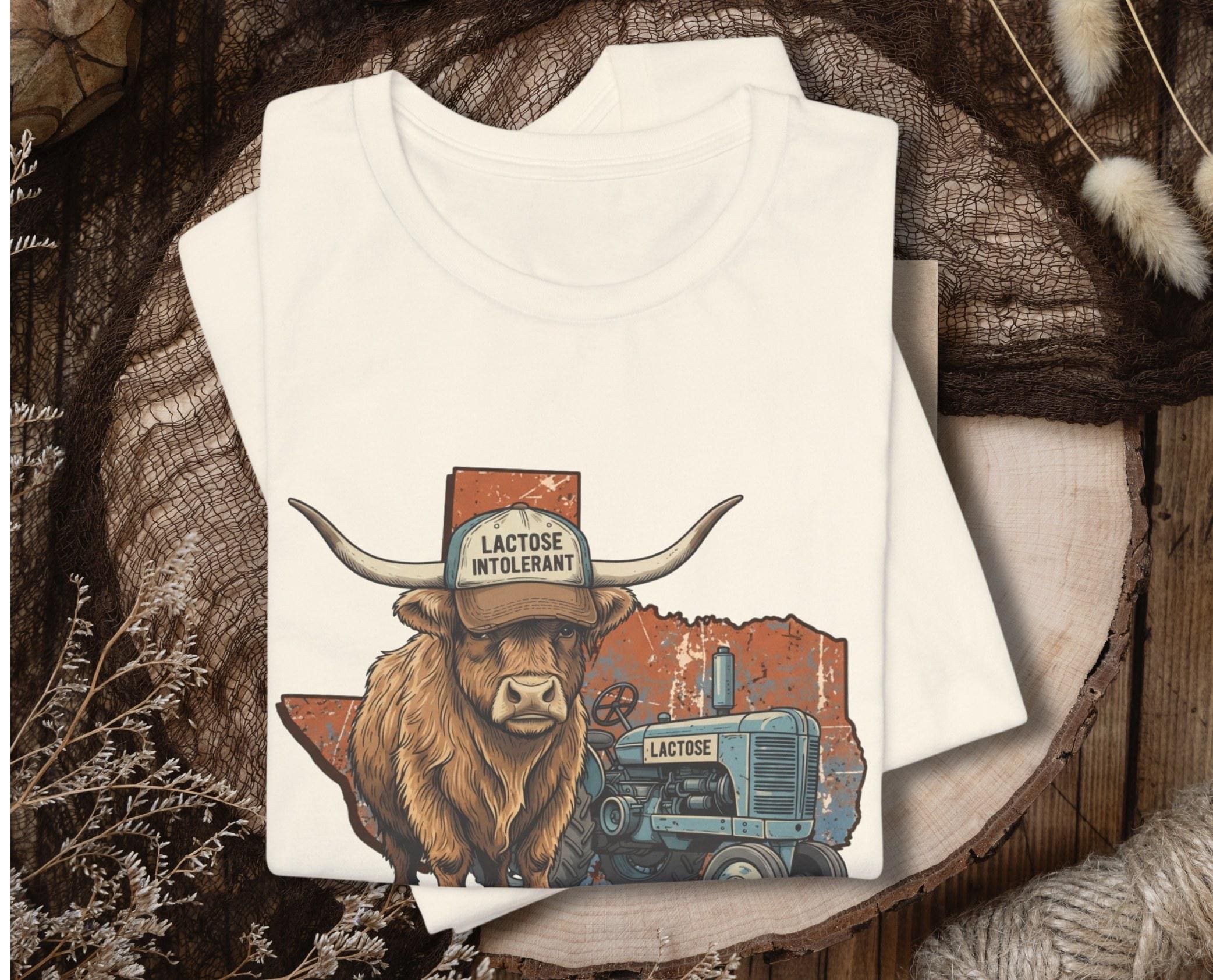 Show off your goofy side with this hilarious Lactose Intolerant Texas cow T-shirt! This design features a fluffy longhorn sporting a cap and posing in front of a distressed Texas state outline and vintage tractor labeled “Lactose.” It’s the perfect blend of Western charm and playful farm humor.