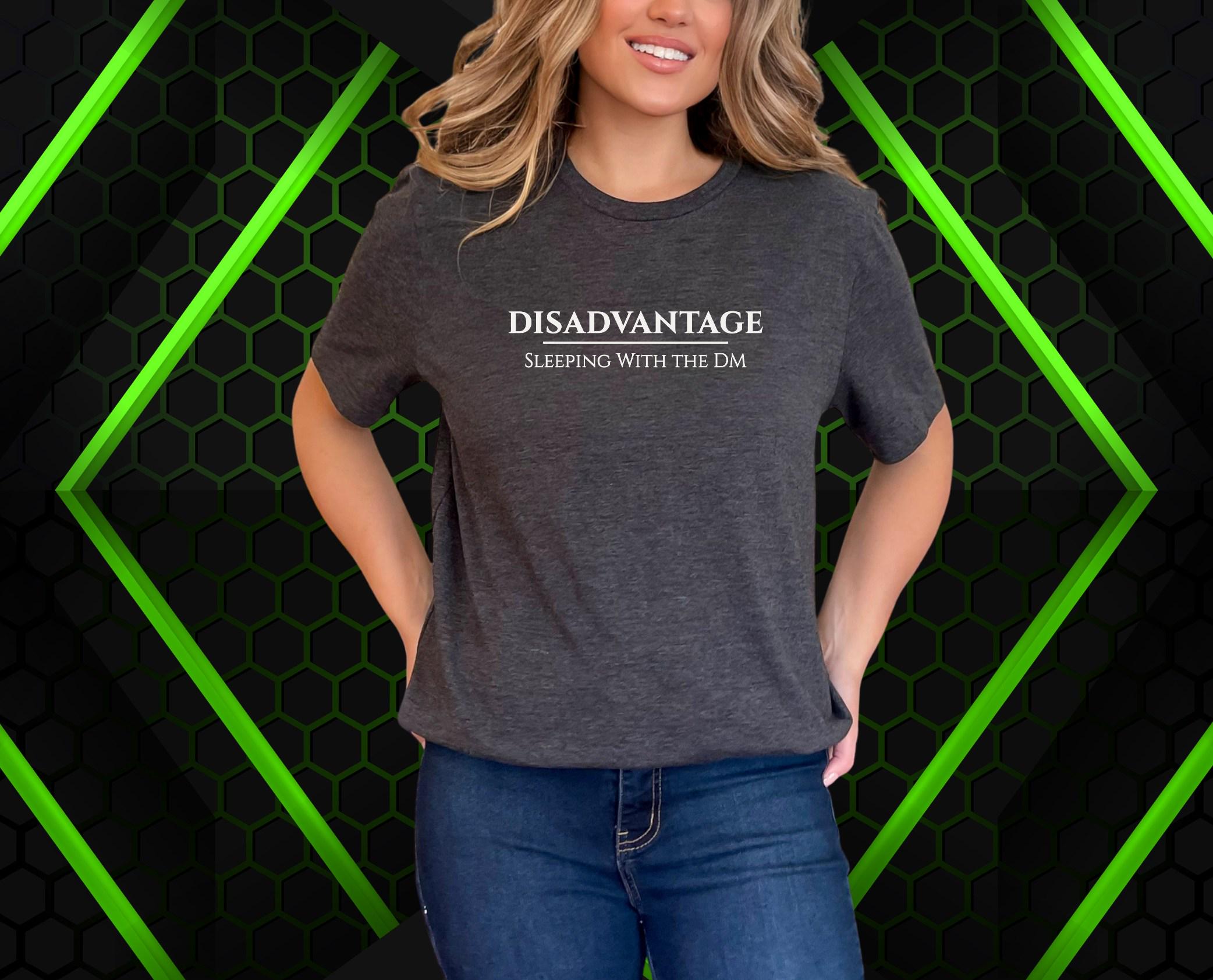 Funny tabletop gamer shirt for RPG players and dungeon masters. A clever inside joke featuring “Disadvantage: Sleeping With the DM” — perfect for game night and conventions.